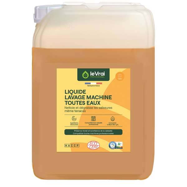 Liquide de lavage machine certifié Ecocert à l’efficacité prouvée, spécialement conçu pour un lavage impeccable de la vaisselle dans les équipements professionnels.