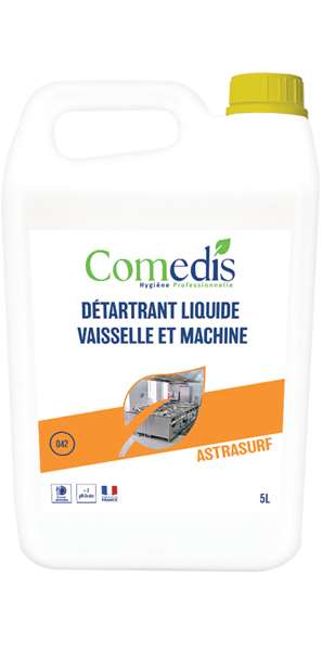 Liquide destiné au détartrage du matériel de lavage de la vaisselle (machines à laver, fours à vapeur, surchauffeurs, gicleurs, robinetteries, carrelages, sanitaires...).