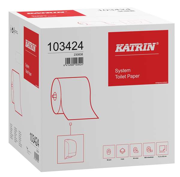 Papier Toilette Katrin System, 2 plis pure pâte, 800 feuilles, 92 mètres par rouleau, colis de 36 rouleaux, format 9,9x11,5